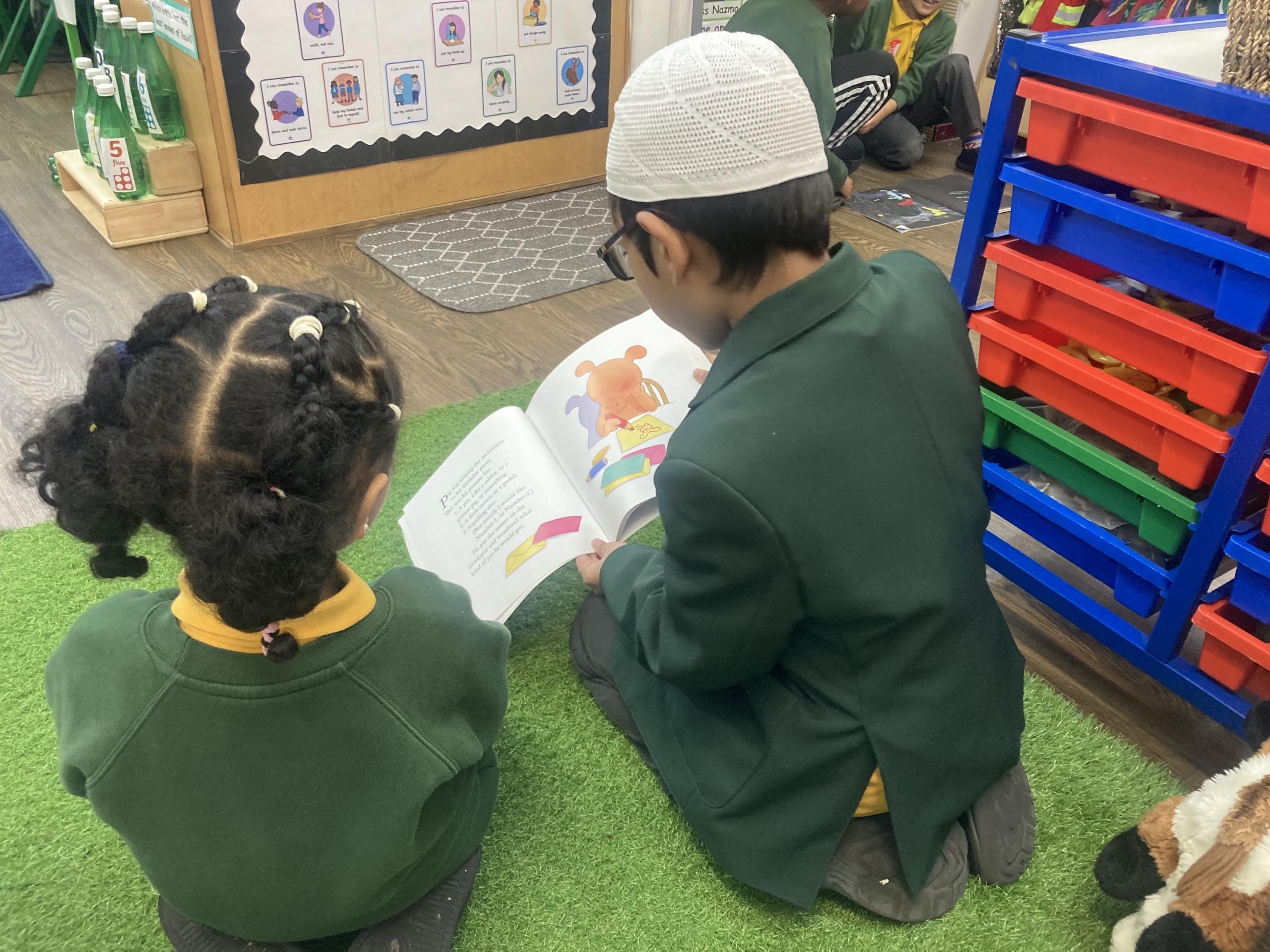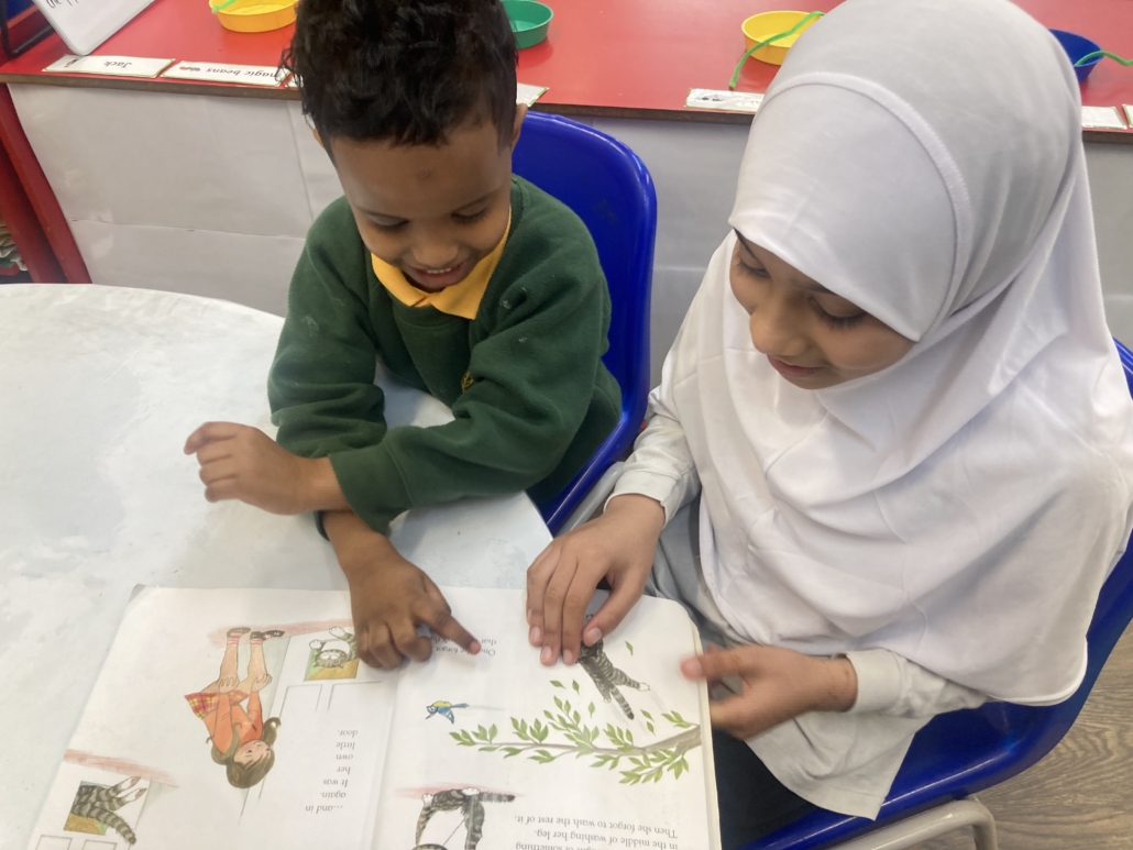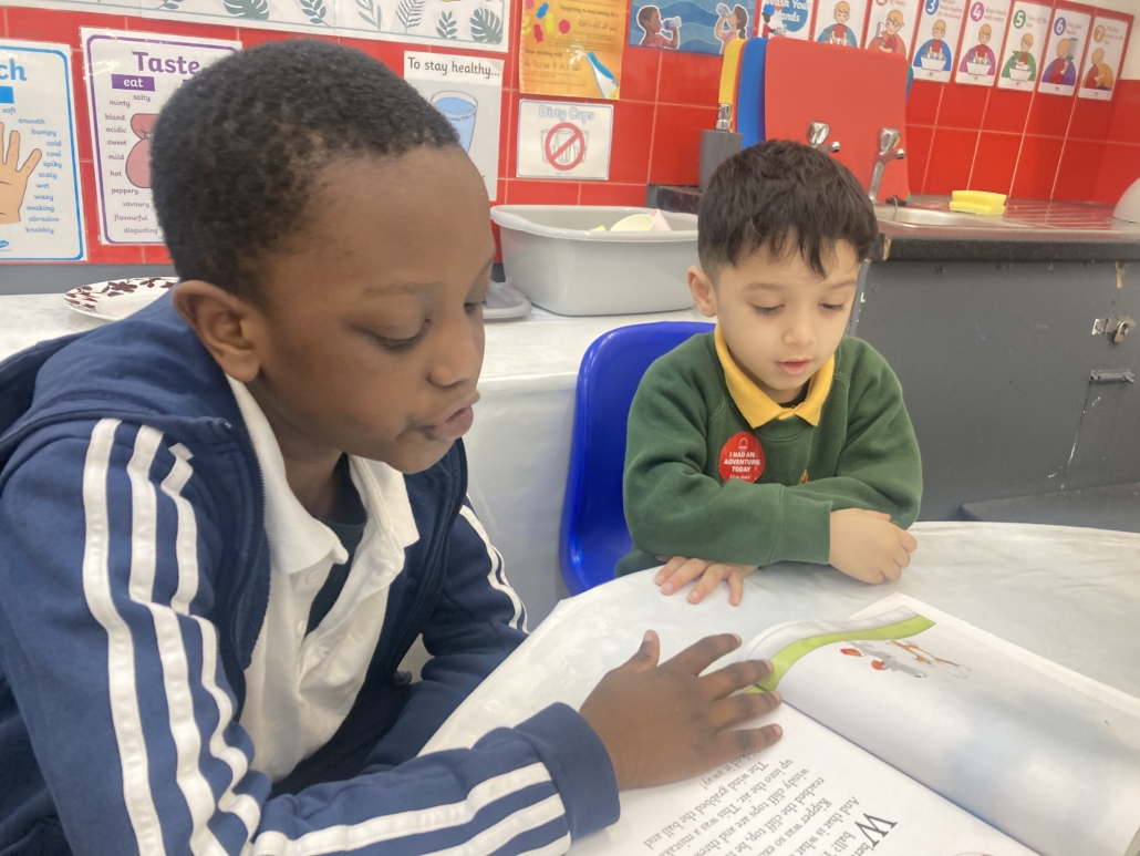 The Year 3 and 4 children were given the opportunity to visit the Year 1 and 2 class, while the Year 5 and 6 children spent time with the Early Years Foundation Stage (EYFS) children, sharing and reading stories together. In addition, the Year 1 and 2 children also had the chance to read to the older pupils, creating a lovely atmosphere of mutual learning and support. It was particularly encouraging to see how attentively the Year 3 and 4 children listened and supported the younger children, helping to boost their confidence in reading. Meanwhile, the Nursery and Reception children chose books they wanted the older pupils to read to them, making the experience even more meaningful and engaging. It was inspiring to observe how well the Year 5 and 6 children shared stories with the younger pupils, demonstrating patience, kindness, and responsibility throughout. The positive interactions between all year groups were a pleasure to witness and highlighted the strong sense of community within the school.